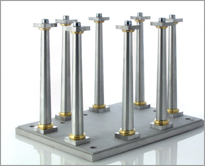 Das Grundgerüst aus Bodenplatte und Säulen. Zu Beginn habe ich die Bodenplatte aus 8mm Alu-Material genau nach Zeichnung auf die Außenmaße gefräst. Danach die erforderlichen Bohrungen angerissen und nach Koordinaten gebohrt, insgesamt 14 Stück. Anthony Mount schreibt in seiner Baubeschreibung, man solle diese Bohrungen etwas größer als den Schraubendurchmesser machen, um leichter Korrekturen der Säulensitze zu den darauf lagernden Rahmen vornehmen zu können. Die acht Säulen sind mit Überlänge von der Stange geschnitten, damit sie zwischen Spitzen konisch gedreht werden können. Der Konus entstand durch Versatz am Reitstock. Danach, auf Länge abgestochen, wurde an beiden Stirnseiten geplant (dabei in konische Hülsen gespannt) und M5 Innengewinde geschnitten.
